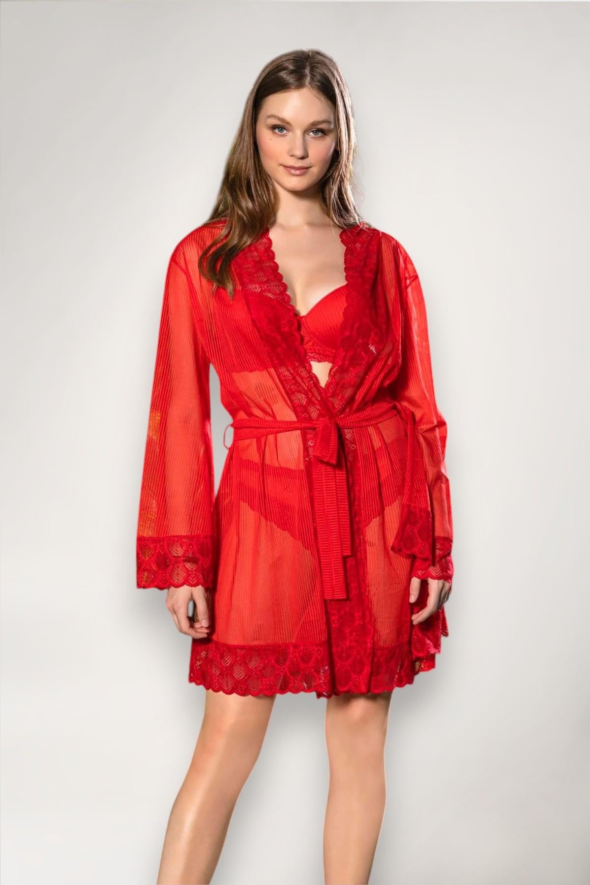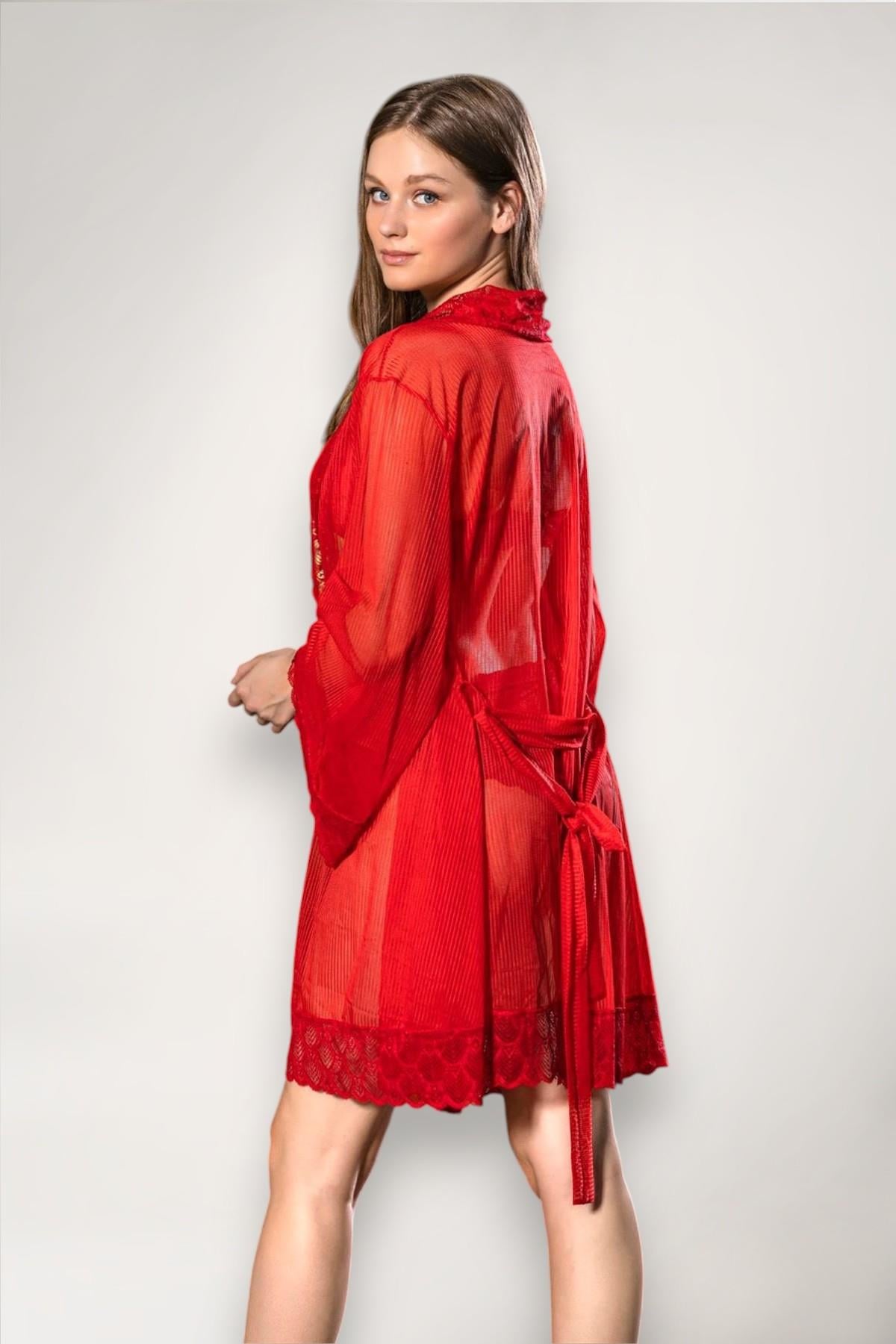 • Tasarım: Kırmızı renkli, transparan (şeffaf) tül kumaştan üretilmiştir ve kuşaklı bir yapıya sahiptir.