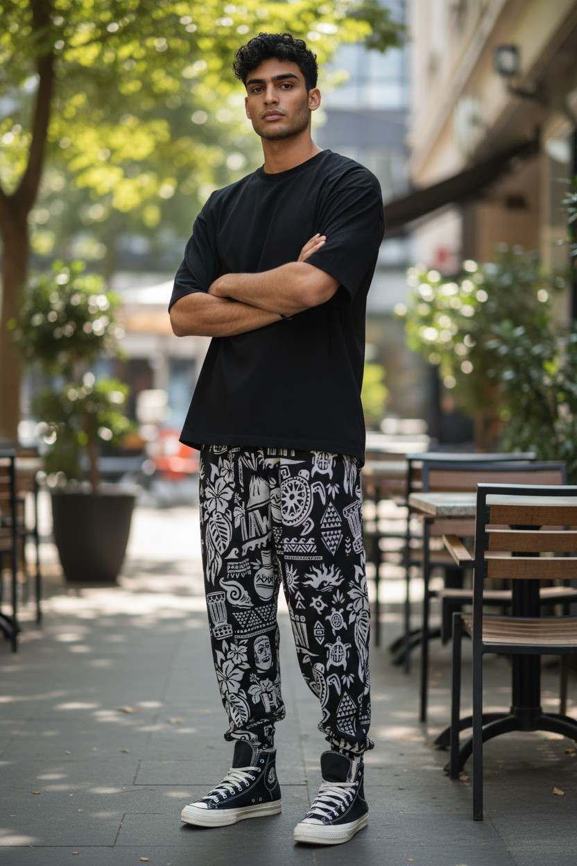 Gangown markasının etnik desenli siyah jogger pantolonu, modern ve rahat tarzı bir arada sunuyor. Kaliteli kumaşı ve esnek yapısı, gün boyu rahatlık sağlarken şık bir görünüm yaratır. Etnik desenler, klasik siyah rengiyle birleşerek çok yönlü bir parça haline geliyor. Spor aktiviteleri, günlük kullanım veya rahat stiliniz için ideal seçim. Esnekliği sayesinde hareket özgürlüğü sunarken, jogger kesimi ile güncel moda trendlerine uyum sağlar.