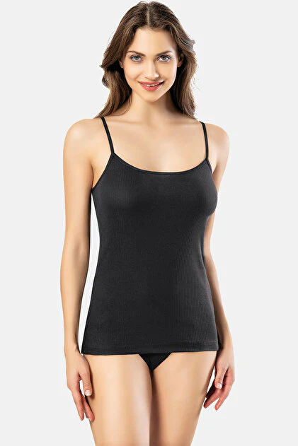 Yumuşak ve esnek kumaşıyla gün boyu konfor sağlayan siyah ip askılı kadın atlet. Günlük kullanım ve iç giyim için ideal, hafif ve şık tasarım.