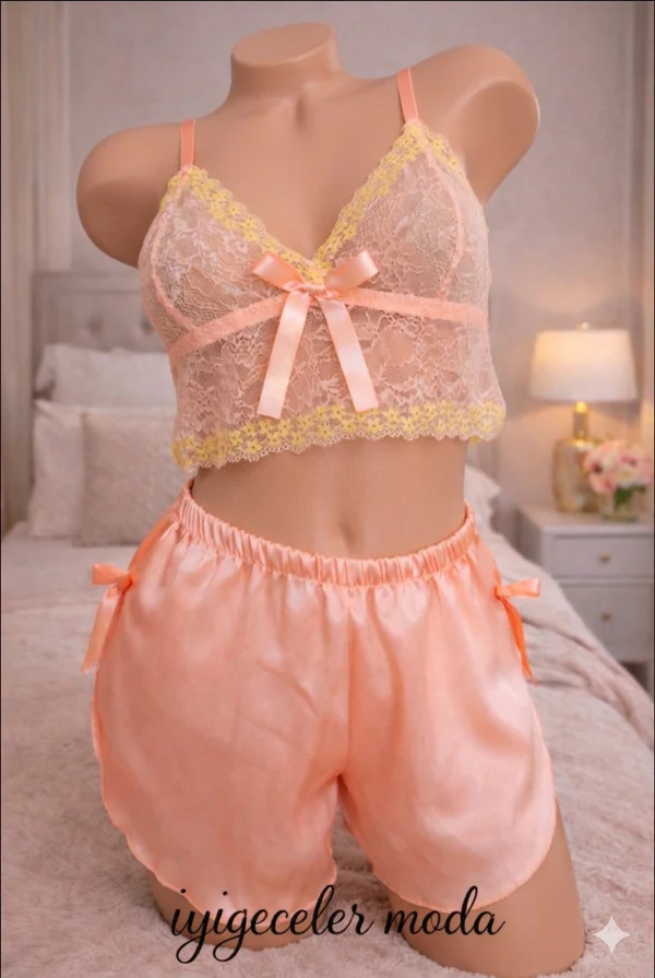 Şıklığı ve konforu bir araya getiren bu özel tasarım pijama takımı, gece stilinize zarif bir dokunuş katmak için tasarlandı. İnce dantel detaylı crop üst ve yumuşak dokulu şorttan oluşan bu takım, hem rahat hem de feminen bir görünüm sunar.