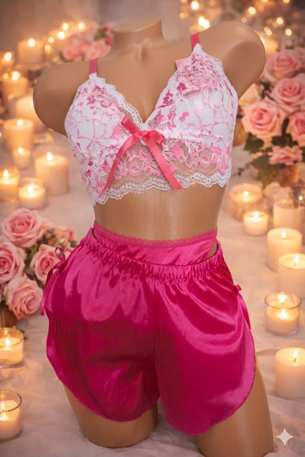Şıklığı ve konforu bir araya getiren bu özel tasarım pijama takımı, gece stilinize zarif bir dokunuş katmak için tasarlandı. İnce dantel detaylı crop üst ve yumuşak dokulu şorttan oluşan bu takım, hem rahat hem de feminen bir görünüm sunar.
