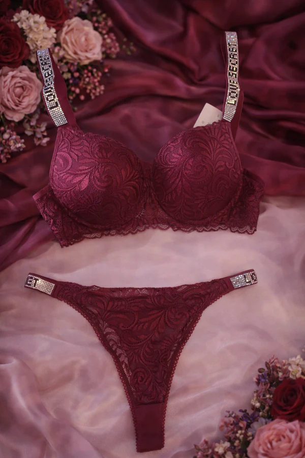 Zarif dantel detayları ve göz alıcı taş işlemeli askılarıyla tasarlanan bu sütyen ve tanga takımı, şıklık ve konforu bir arada sunar. Destekli sütyen yapısı göğüsleri toparlayarak daha dolgun ve estetik bir görünüm sağlarken, yumuşak ve esnek kumaşı gün boyu rahat kullanım sunar.