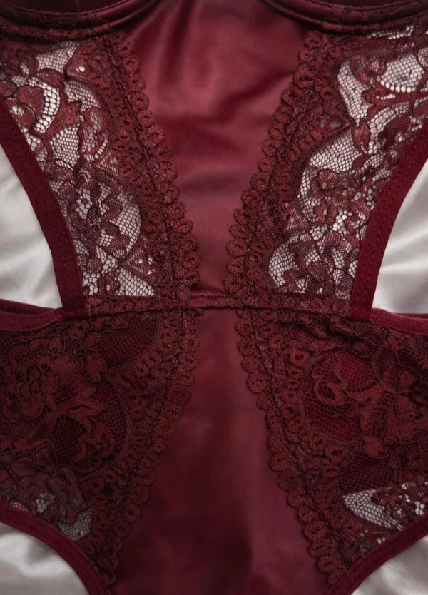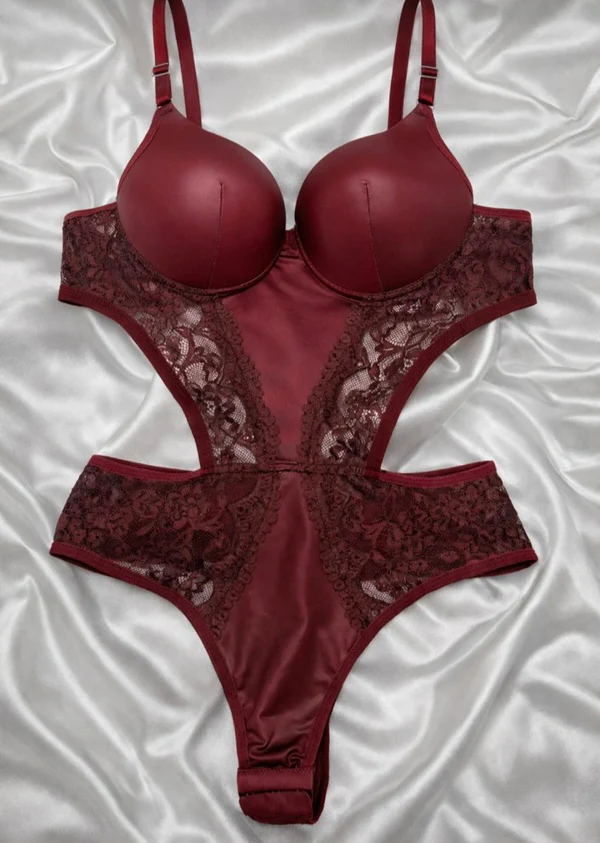 Deri dokusu ve zarif dantel detaylarıyla tasarlanan bu bordo body, şıklık ve çekiciliği bir arada sunar. Destekli kap yapısı göğsü toparlar ve form verirken, transparan dantel bölümler feminen bir hava katıyor.