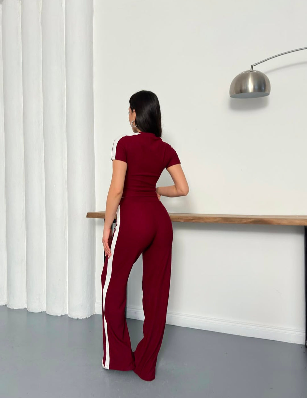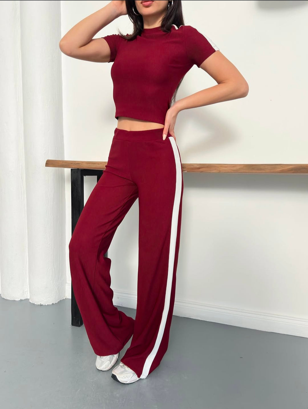 Vücuda oturan crop üst feminen bir siluet oluştururken, yüksek bel ve yan şerit detaylı bol paça pantolon boyu daha uzun ve fit gösterir.