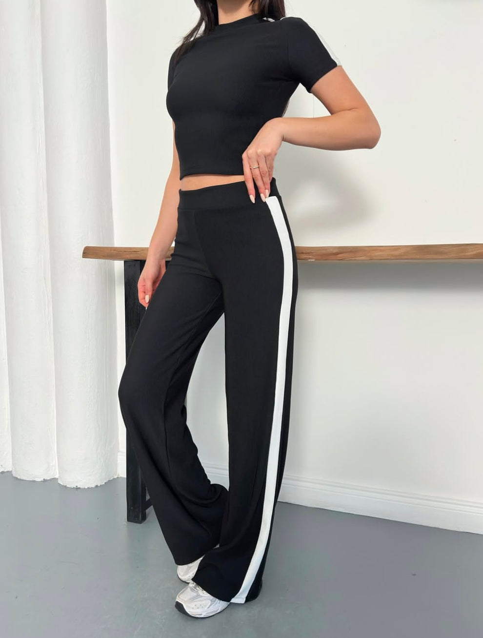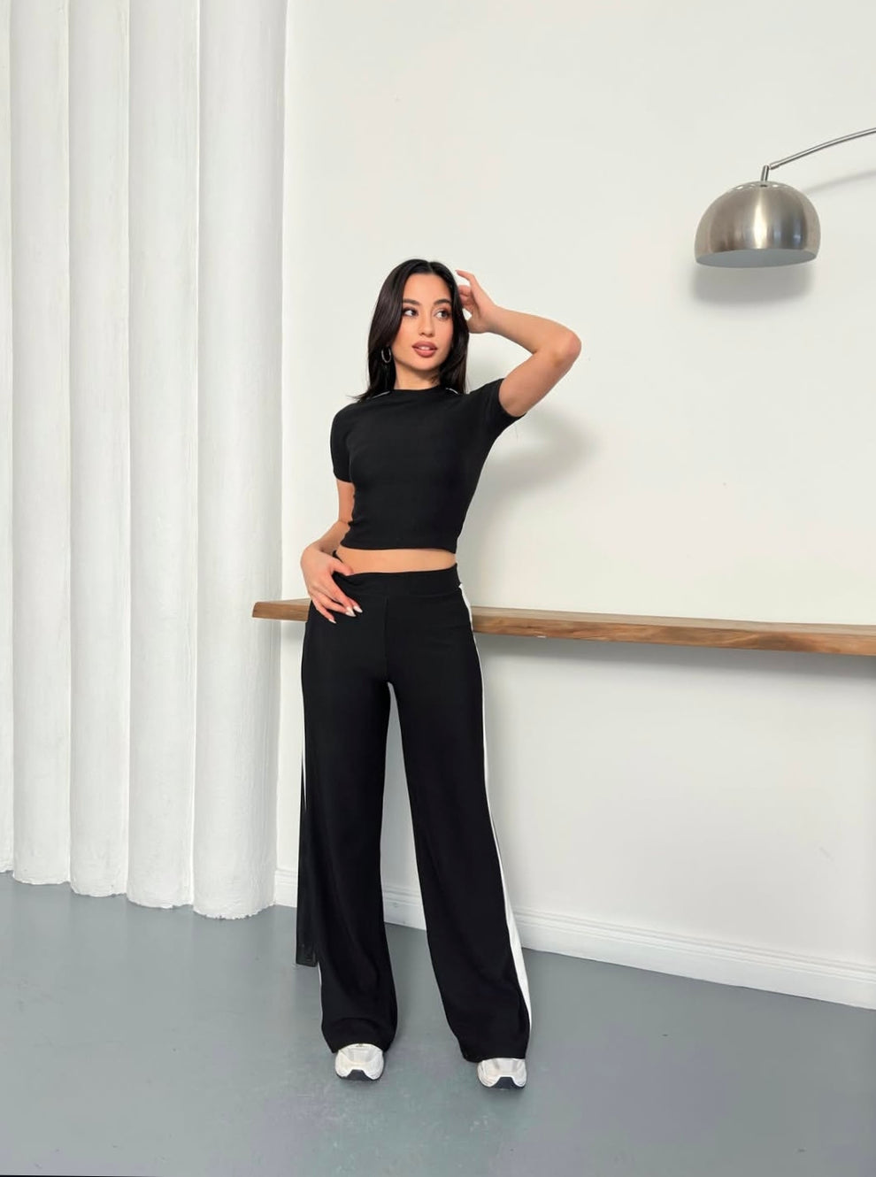 Kısa kollu, vücuda oturan crop üst feminen bir siluet sunarken; yan şerit detaylı yüksek bel pantolon boyu daha uzun ve fit bir görünüm sağlar.
