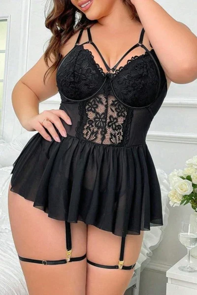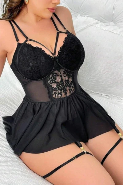Dantel detaylı üst yapısı ve etek formundaki kesimiyle tasarlanan büyük beden dantelli siyah jartiyerli babydoll, büyük beden vücut yapısına uyum sağlayan rahat bir kullanım sunar. Destekli üst bölüm göğüsleri toparlarken, belden aşağıya doğru açılan babydoll form bedeni sıkmadan dengeli bir siluet oluşturur.